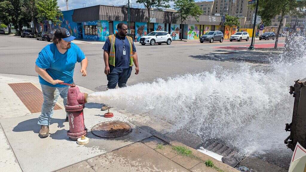 City workers open up the fire hydrant near site for garden volunteers to help water the site and ensure the success of the grasses.